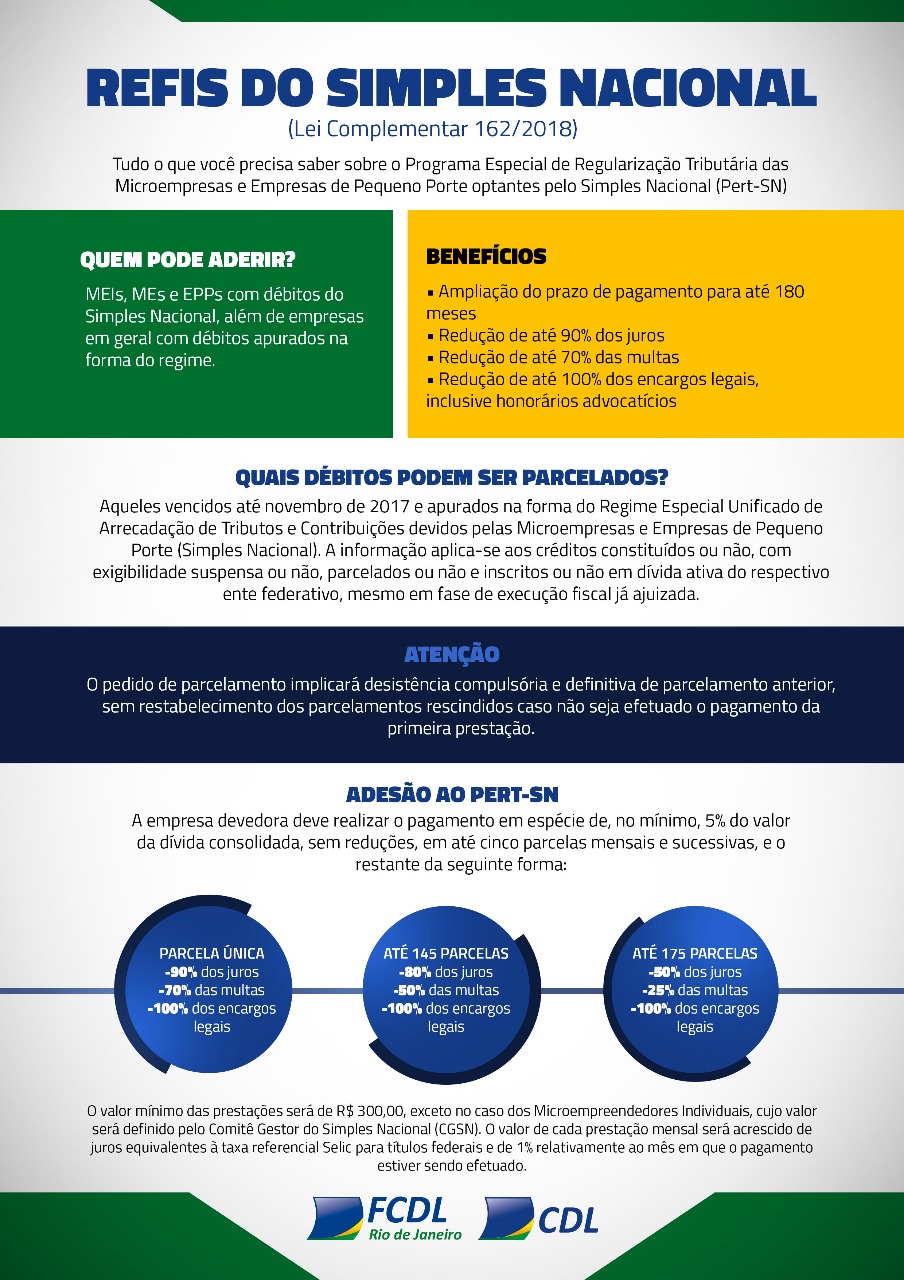 A Lei Complementar 162/2018, que institui o Refis para micro e pequenas empresas, foi promulgada e publicada no Diário Oficial no dia 9 de abril e entra em vigor. Aprovado no ano passado e vetado pelo presidente da República integralmente, o projeto voltou ao Congresso no início de abril e teve o veto derrubado após reivindicações e mobilização de setores produtivos – entre eles as CDLs de todo o Brasil através de sua Confederação e Federações.