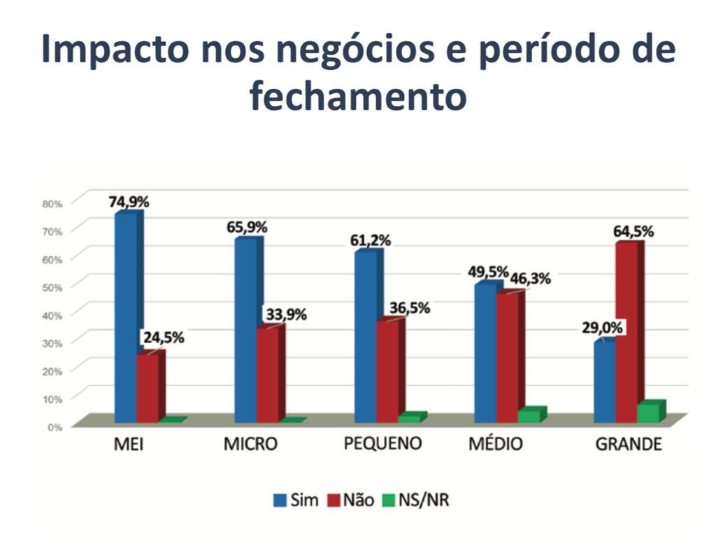 Em relação aos impactos nos negócios, 66,2% das empresas alegam ter tido problemas de falta de recursos no caixa ao longo desses meses de pandemia e que, quanto menor o porte da empresa, maior essa porcentagem, chegando a 75% dos MEI’s. No entanto, a análise por setor mostra a grande diferença entre as empresas que fazem parte das atividades essenciais e as demais. Enquanto a maioria de Supermercados e Farmácias não passou por esse problema (51,6% e 71%, respectivamente), 62,6% do Comércio Varejista, 75,1% Serviços e 82,5% de Bares e Restaurantes conviveram, ou ainda convivem com essa realidade. De acordo com a CDL Barra Mansa, a porcentagem de empresas que relatam problemas de recursos no caixa aumenta de acordo com o tempo que precisou ficar fechada.